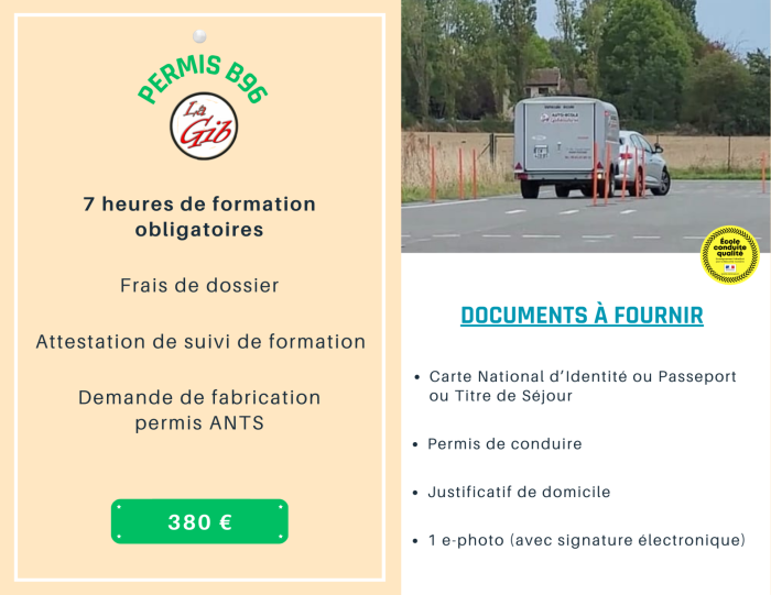 Formation de 7 heures. L'ensemble voiture et remorque (PTAC) est inférieur à 4250 kg. Cette formation est réalisée sous la présence constante et effective de l'enseignant.